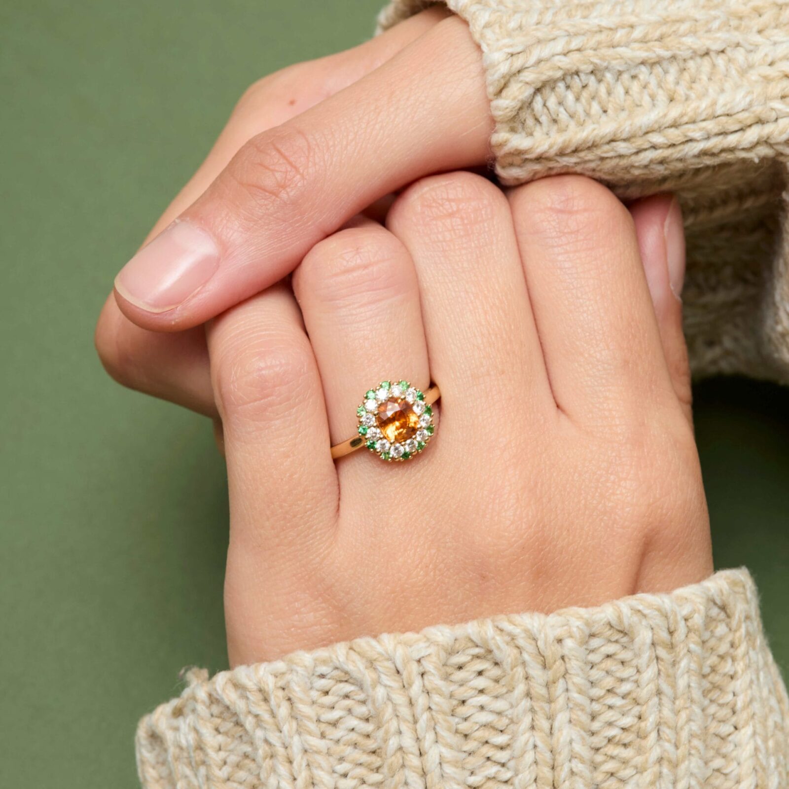 - Bague en or jaune sertie d’un Grenat Mandarin de 1.15 carats de forme coussin accompagné de 12 Tsavorites de 1.5mm (0,10 carats) et Diamants 12 FVS de 2mm. (0,36 carats)