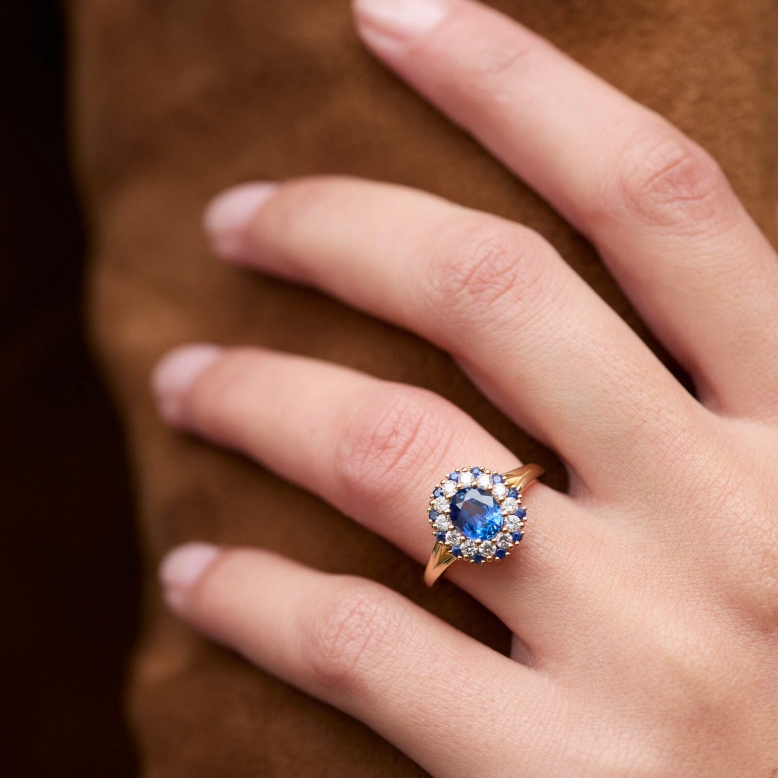 - Bague Colombo Ella en or jaune sertie d’un Saphir Cornflower de 2.04 carats non chauffé de forme ovale accompagnée d’un double entourage de 14 diamants FVS de 2mm (0.42 carats) et 14 Saphir Bleu de 1.5mm (0.15 carats).