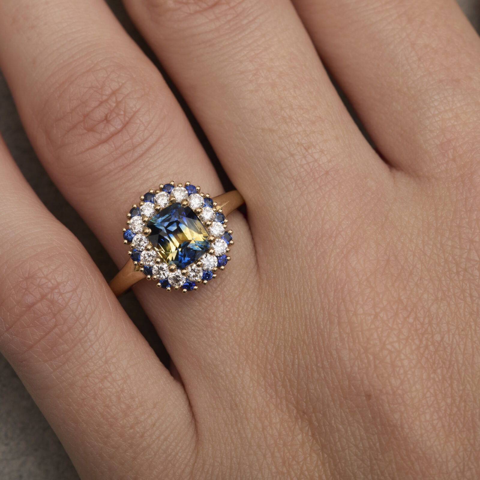 Le saphir bicolore, aux nuances mêlées de bleu et de jaune, trouve un équilibre parfait dans l’éclat de l’or jaune. Le double entourage vient souligner chaque contraste avec subtilité et élégance.