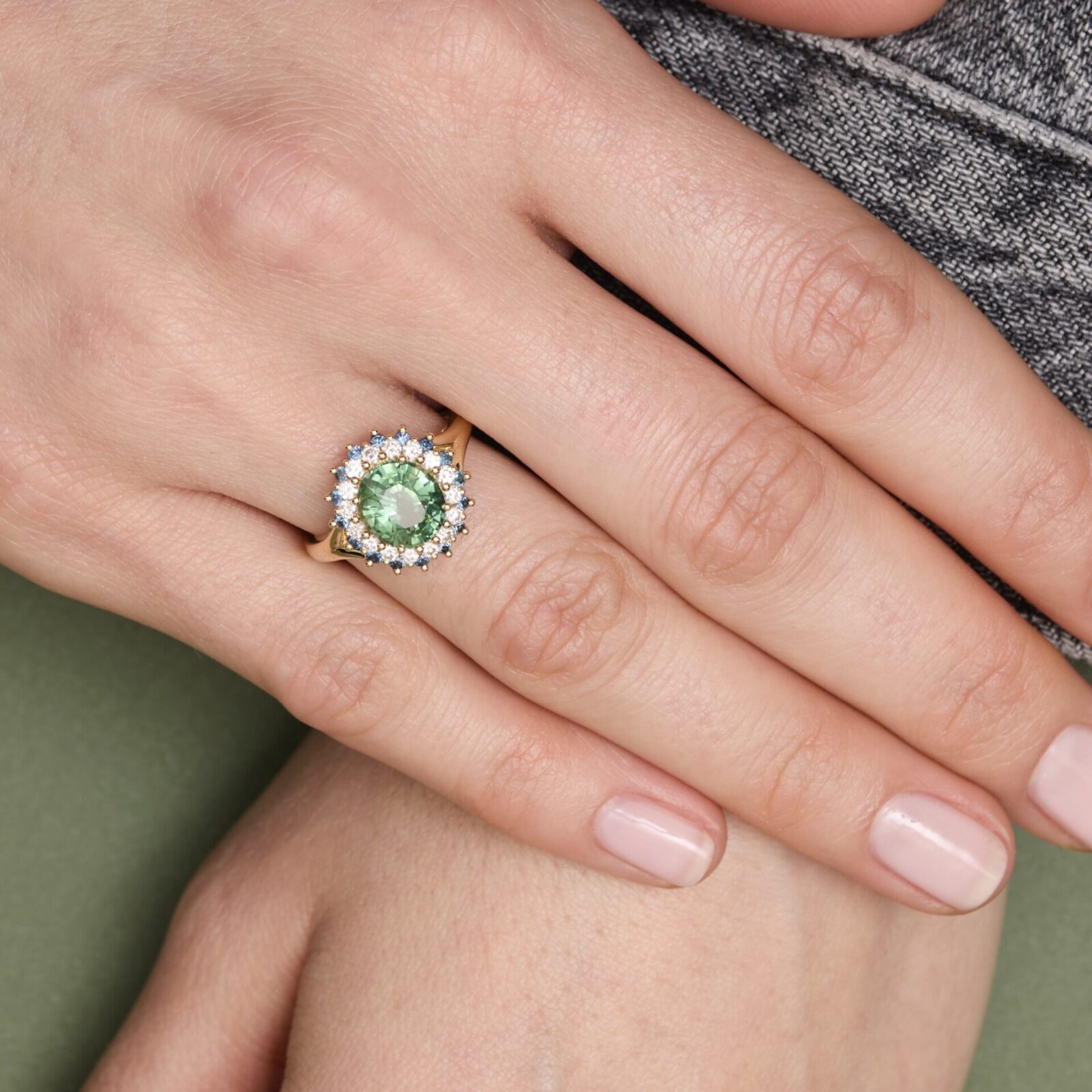 - Bague Colombo Ella en or jaune sertie d’un Saphir Teal de 2.58 carats de forme ovale accompagnée d’un double entourage de 16 diamants FVS de 1.8mm (0.40 carats) et 16 Saphir Teal de 1.5mm (0.15 carats).