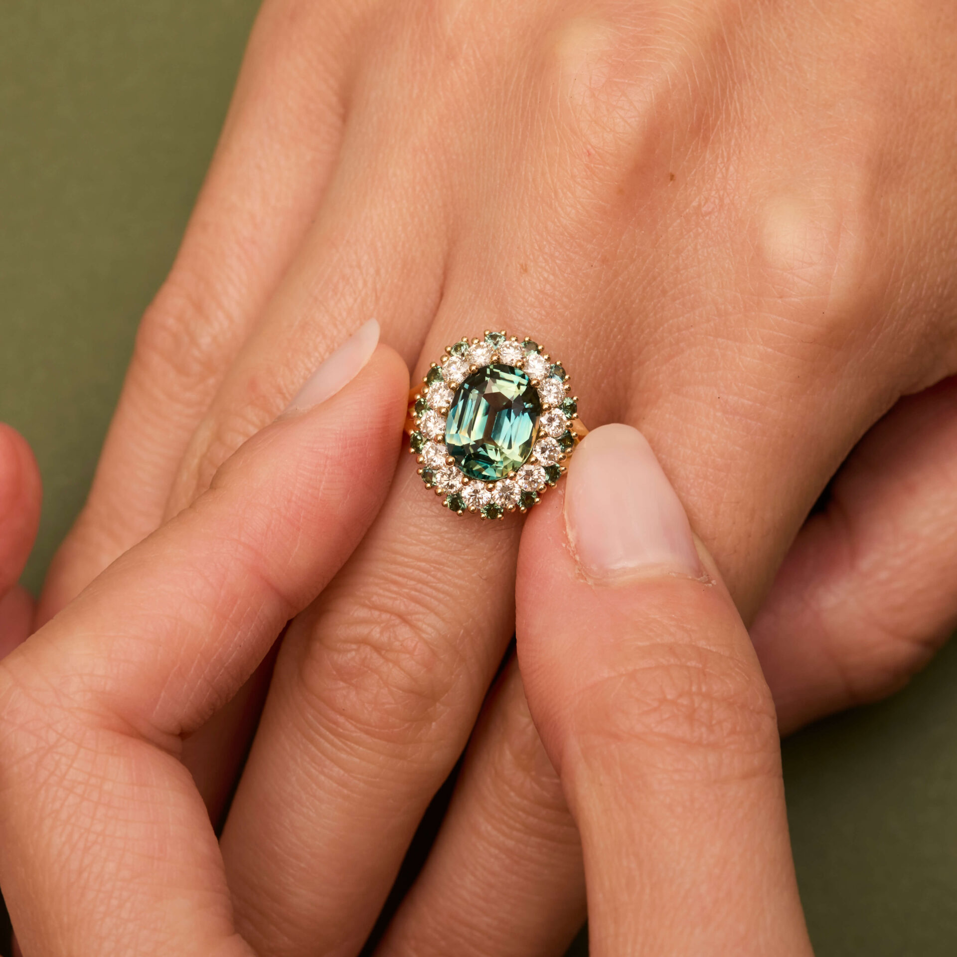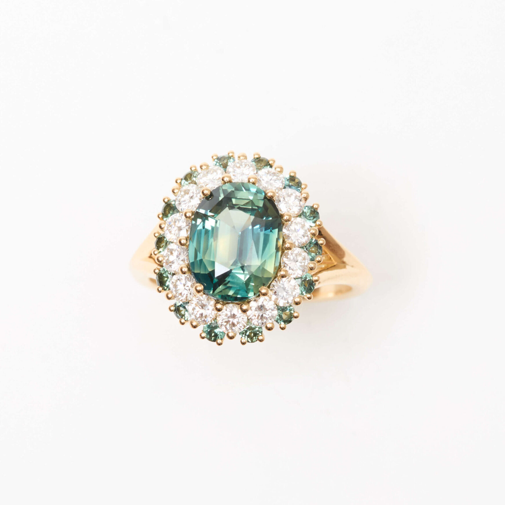 - Bague Colombo en Or jaune sertie d’un Saphir Teal de 3.03 carats de forme ovale accompagné d’un double entourage de 14 diamants FVS de 2.4mm (poids 0.70 carats) et de 14 Saphirs Teal de 1.8mm (poids total 0.15 carats).