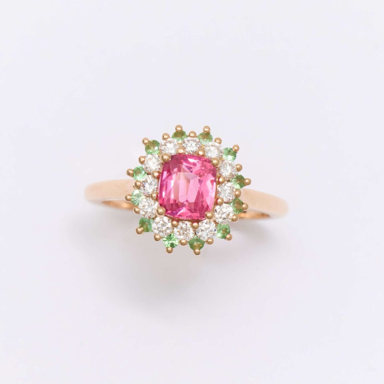 - Bague Colombo en or rose sertie d’un Spinelle Mahenge de 0.98 carats de forme coussin, accompagnée de 12 diamants FVS de 2mm (0.39 carats) et d’un entourage de 12 Tsavorite Mint de 1.5mm (0.12 carats)