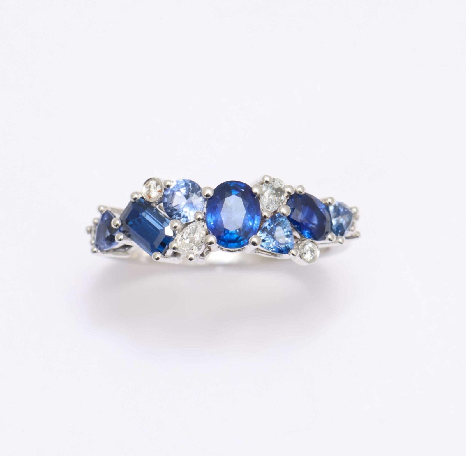 • Bague en or blanc sertie d’une constellation de Saphirs Peacock (poids total 1.86 carats)