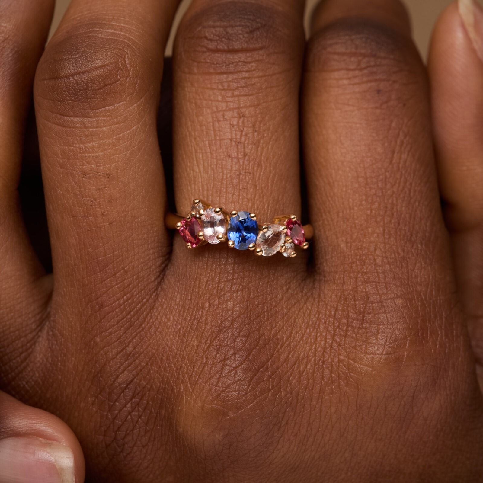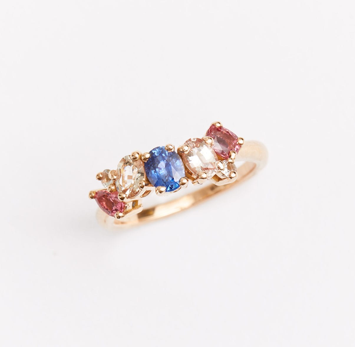 Bague Constellation en or rose 18 carats, sertie d’un Saphir Vivid Blue accompagné de Saphir Pêche et Spinelle Mahenge.