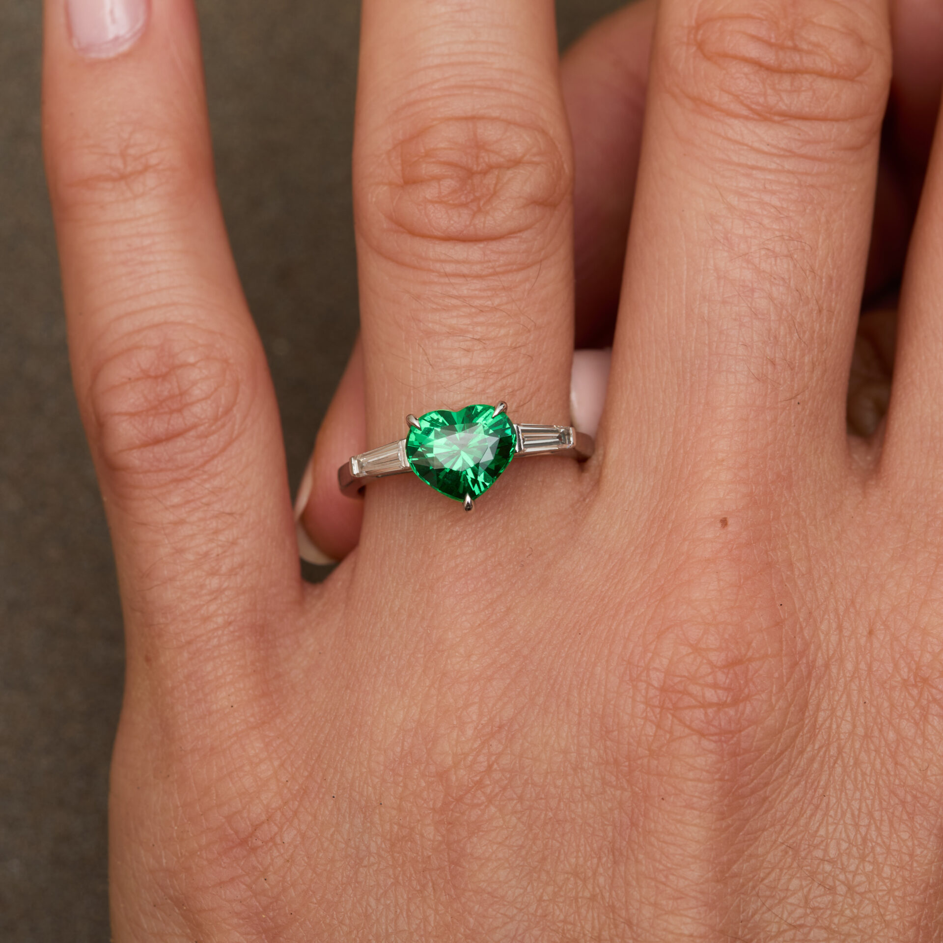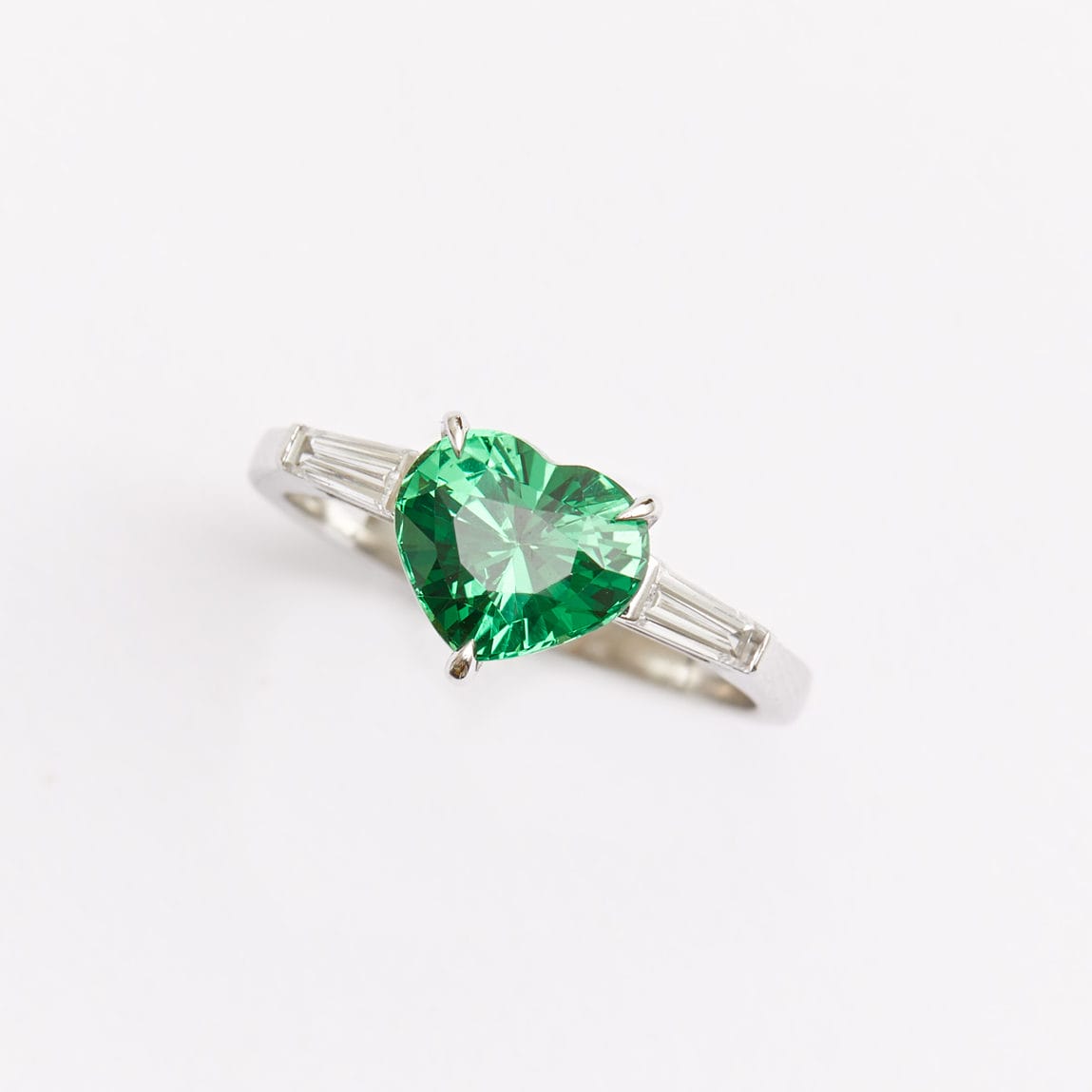 - Bague Elahera en or blanc 18 carats, sertie d’une Tsavorite de 2.11 carats accompagné de diamants tappers 0.38 carats.