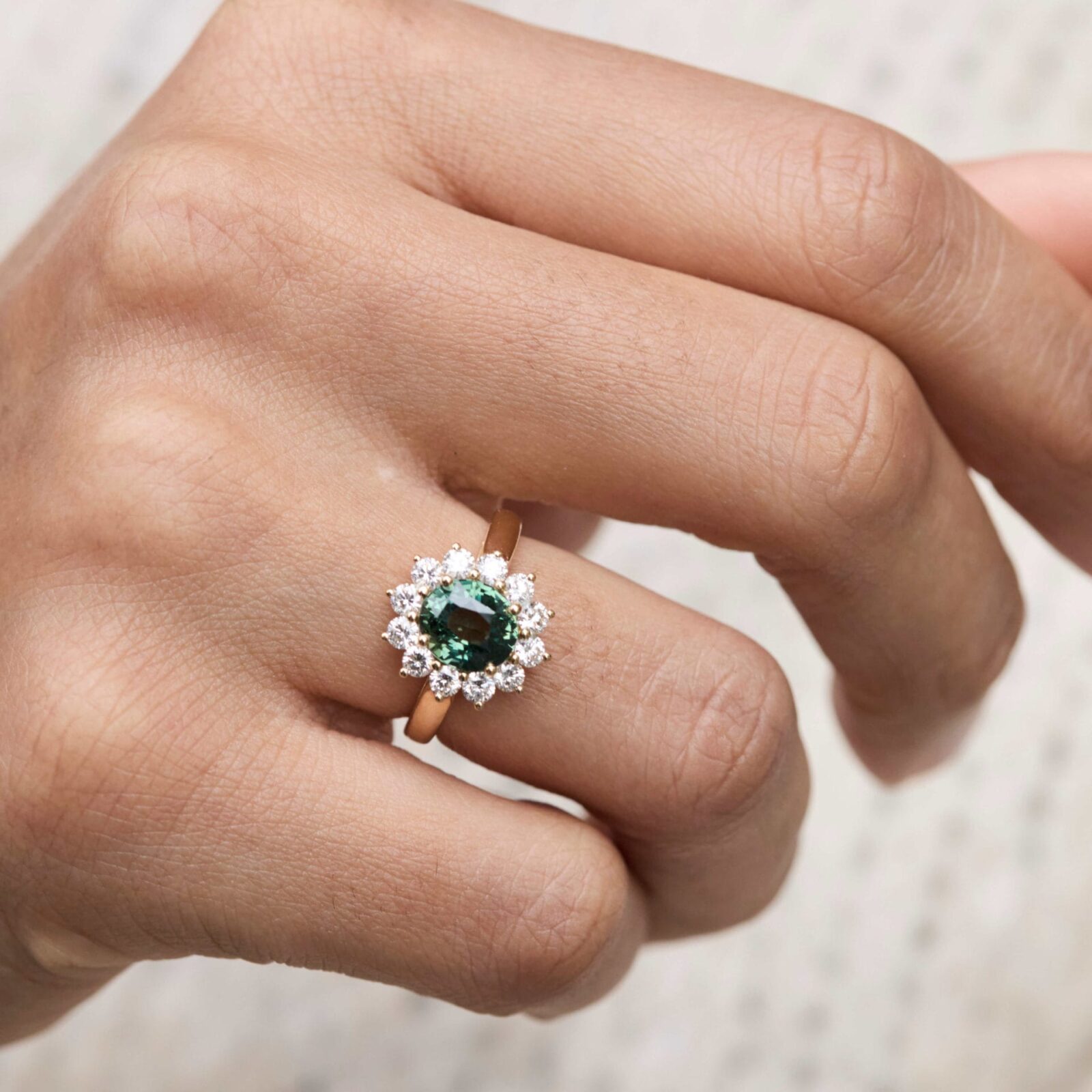 Cette bague Ella, modèle emblématique de notre marque inspirée de l’iconique bague Marguerite, met en valeur un incroyable saphir teal. Ses reflets verts et bleus insufflent une modernité inouïe à ce bijou. L’or jaune, en contraste avec cette touche contemporaine, ajoute une élégance classique.