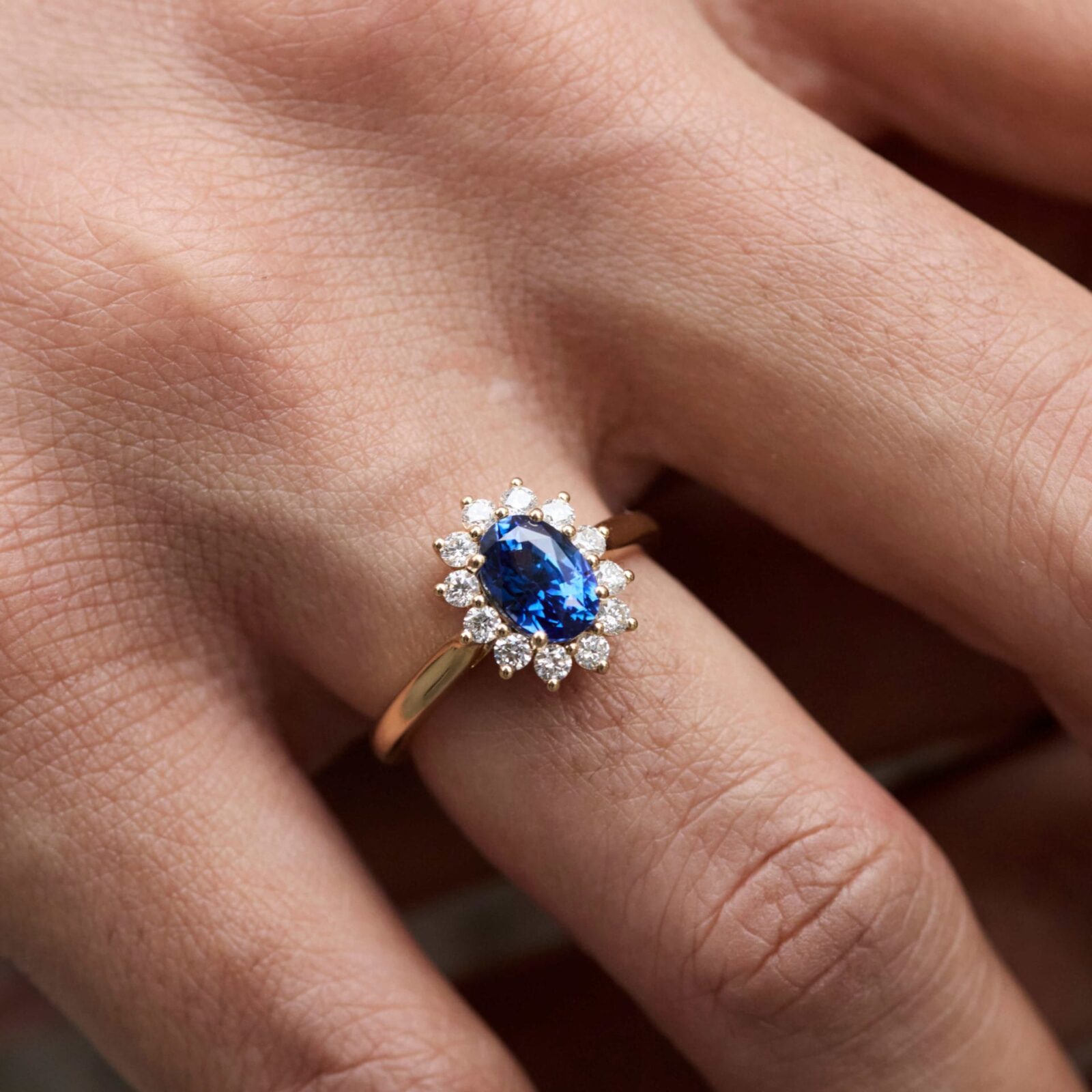 - Bague en or jaune sertie d’un saphir Vivid Blue de 1.78 carats de forme ovale entouré de 12 diamants FVS de 2.1mm (poids total 0.41 carats)
