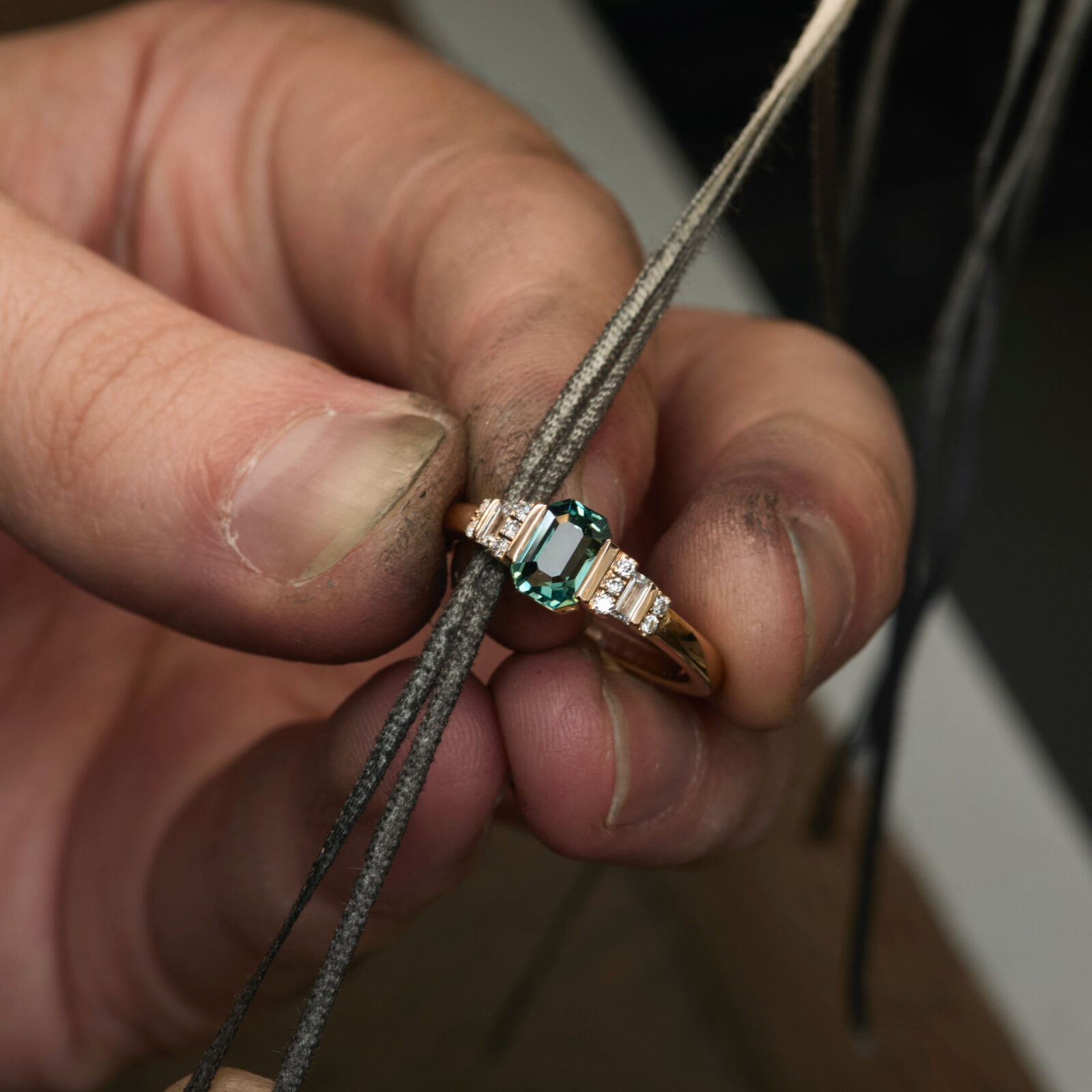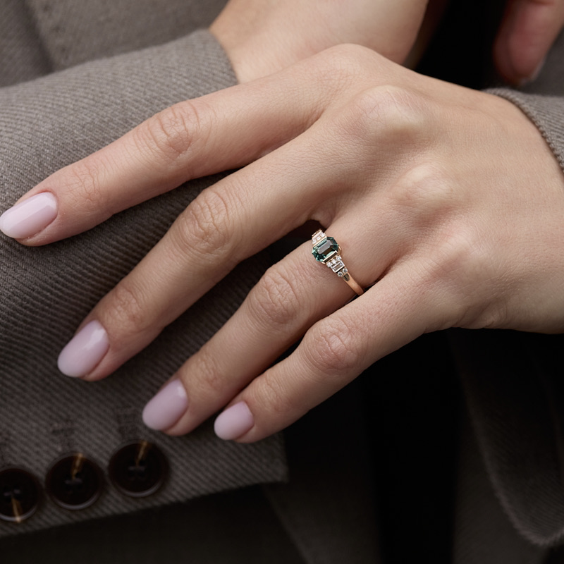 La bague Esmeralda Art Deco, avec son saphir Teal taillé en émeraude, reflète l’élégance intemporelle. L’or rose enveloppe la pierre avec simplicité, soulignant le style Art Deco avec une touche moderne.