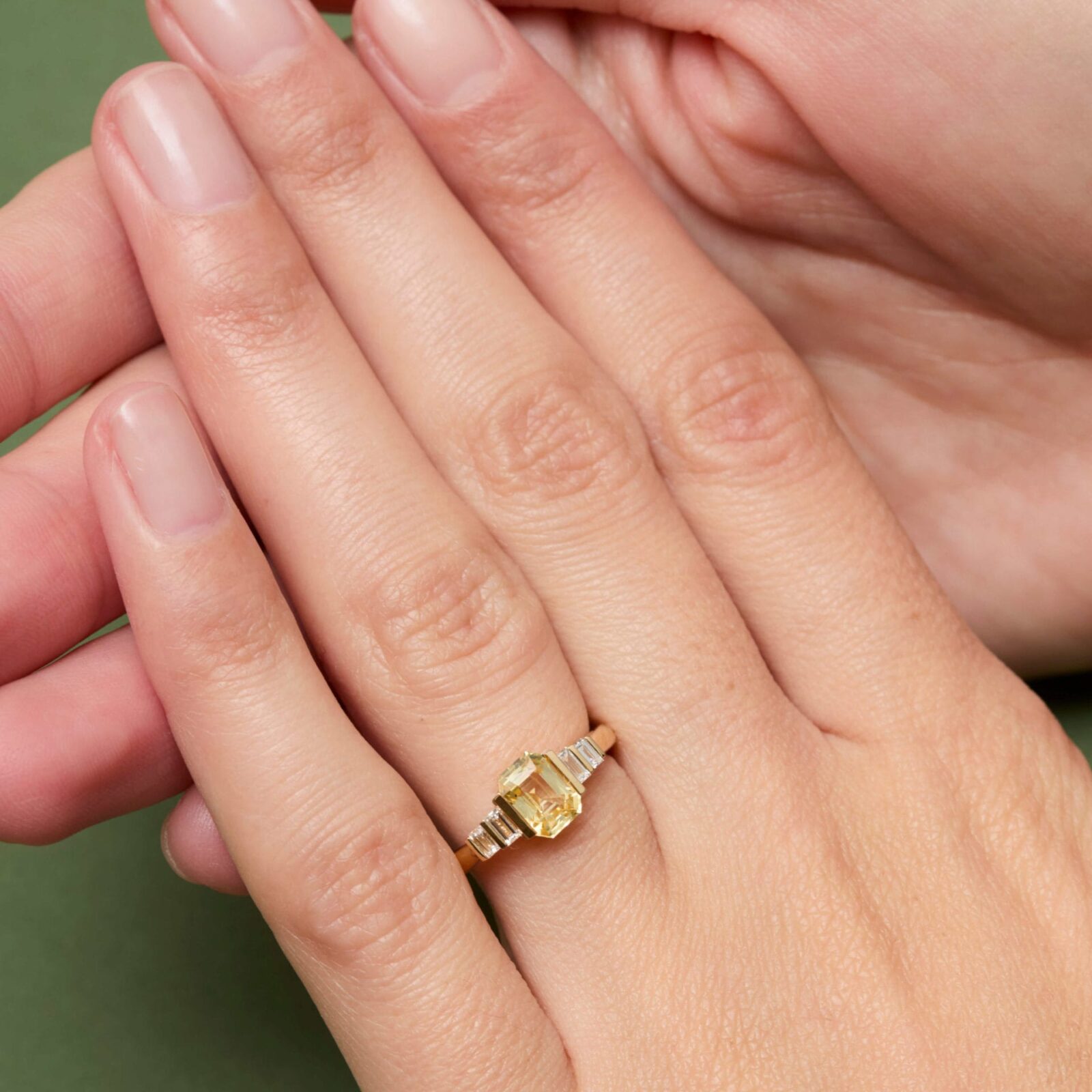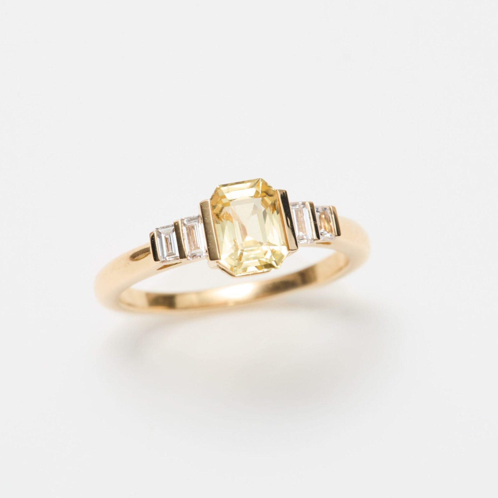- Bague Esmeralda en or jaune sertie d’un Saphir Jaune de taille émeraude de 1.21 carats accompagné de 2 diamants baguette FVS de 3 x 1.5mm et 2 diamants baguette FVS de 2.5 x 1.5mm (poids total 0.19 carats).