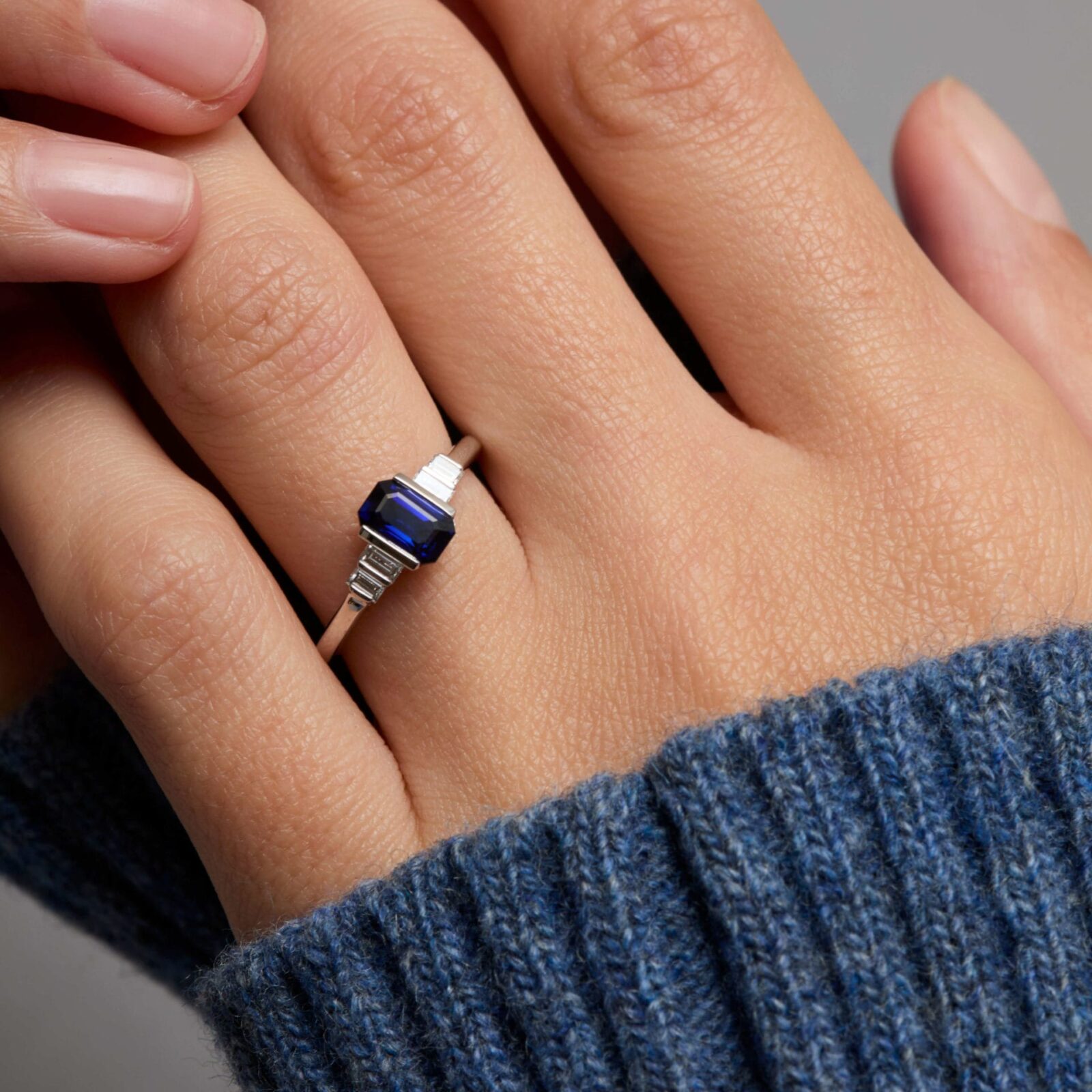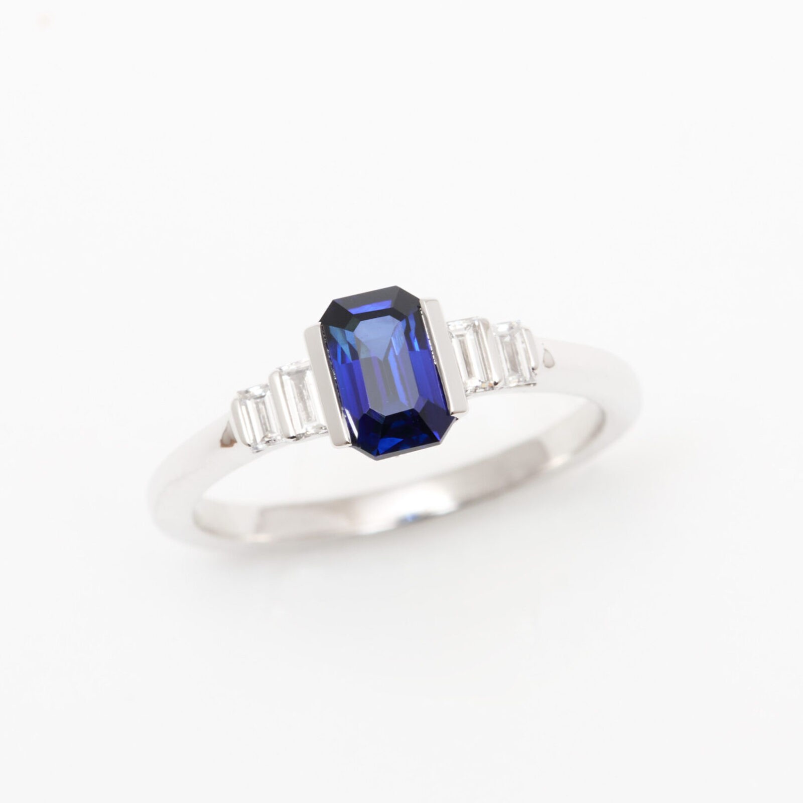 - Bague Esmeralda en or blanc sertie d’un Saphir Royal Blue de 1.03 carats de taille émeraude accompagnée de 2 diamants baguette FVS de 3 x 1.5 mm et 2 diamants baguette FVS de 2.5 x 1.5 mm. (poids total 0.18 carats)