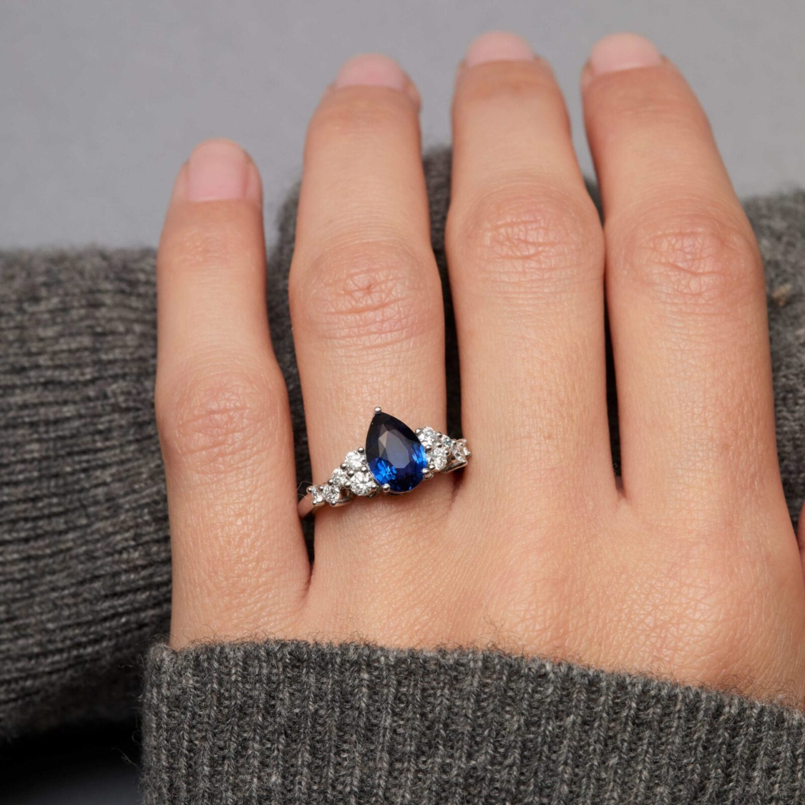 • Bague Horana en or blanc sertie d’un Saphir Peacock de 2.10 carats de forme poire, accompagnée d’une constellation de 10 diamants FVS (poids total 0,48 carats)