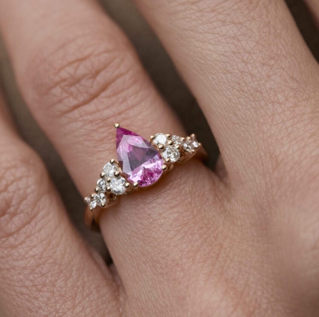- Bague Horana en or rose sertie d’un Saphir Rose de 1.21 carats de forme poire, accompagnée d’une constellation de 10 diamants FVS (poids total 0,37 carats)