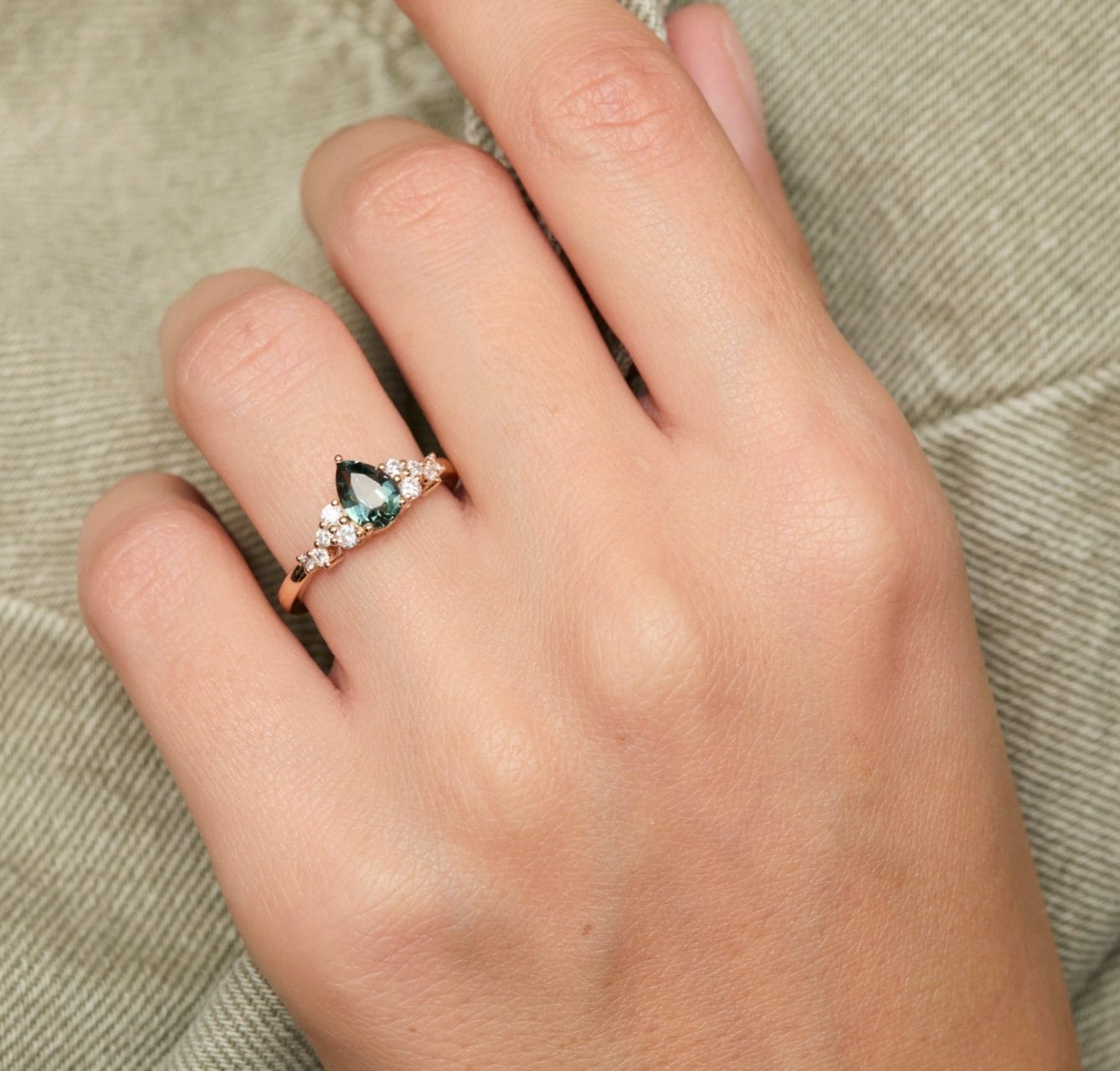 - Bague Horana en or rose sertie d’un Saphir Teal de 1.13 carats de forme poire, accompagnée d’une constellation de 10 diamants FVS (poids total 0.27 carats)