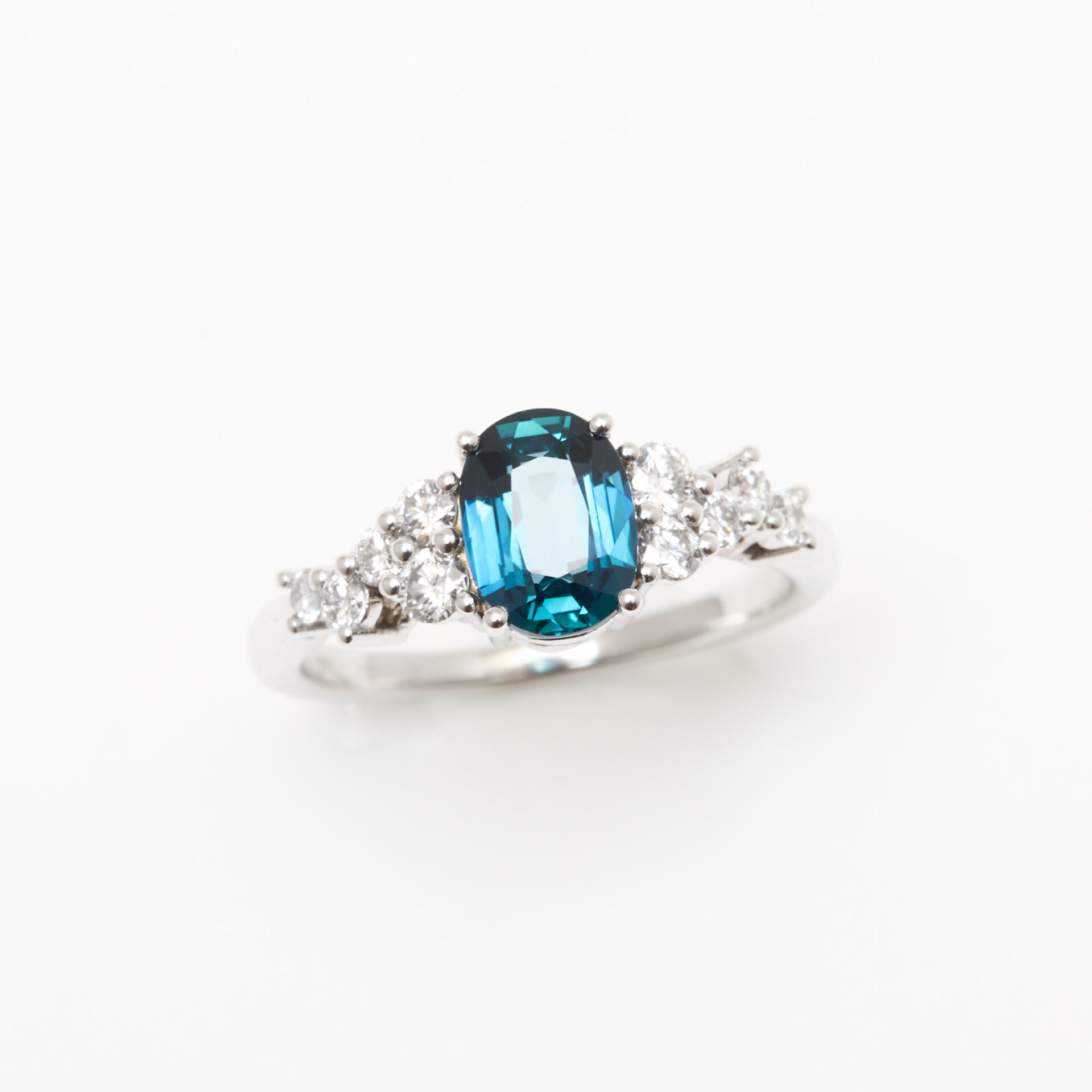 - Bague Horana en or blanc sertie d’un Saphir Teal de 1.57 carats de forme ovale, accompagnée d’une constellation de 10 diamants FVS (0.37 carats au total)