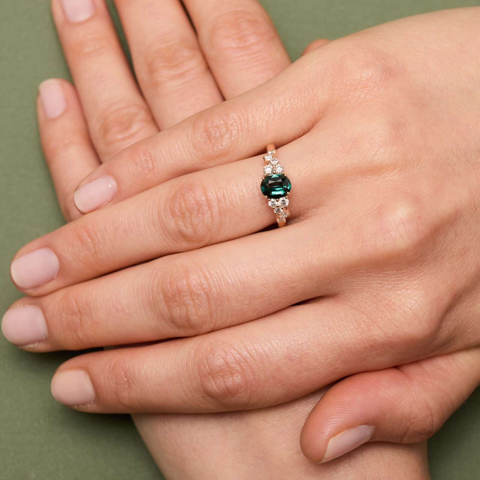 - Bague Horana en or rose sertie d’une Saphir Teal de 1.12 carats de forme ovale accompagnée d’une constellation de 10 diamants FVS (0,37 carats au total).