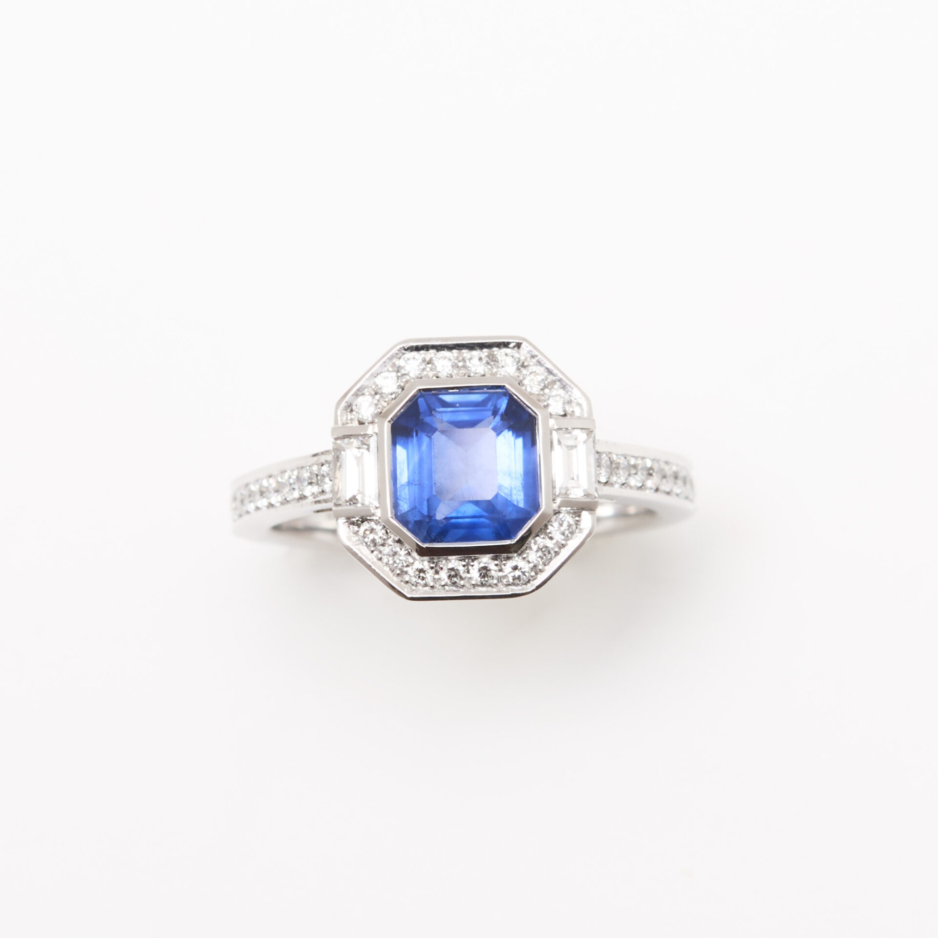 - Bague Jaffna Art Déco en or blanc sertie d’un Saphir Peacock de 1.61 carats de taille émeraude accompagné de 34 diamants FVS de 1.2mm et 2 diamants FVS baguette de 3x2mm (poids total 0.38 carats)