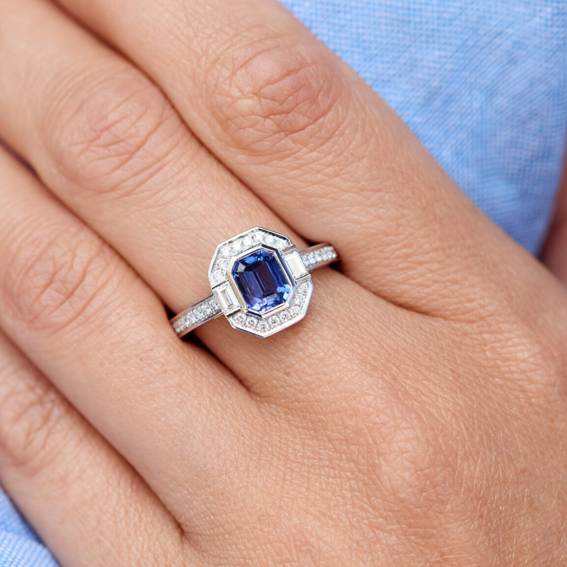 • Bague Jaffna Art Déco en or blanc sertie d’un Saphir Violet de 1.21 carats de taille émeraude accompagné de 34 diamants FVS de 1.2mm et 2 diamants FVS baguette de 3x2mm  (poids total 0.10 carats)
