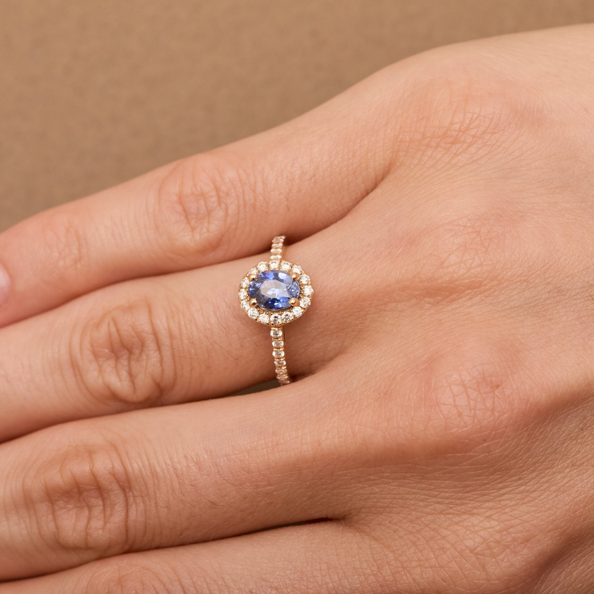 Bague Jaffna en or rose 18 carats, sertie d’un Saphir Cornflower de 1,10 carats.