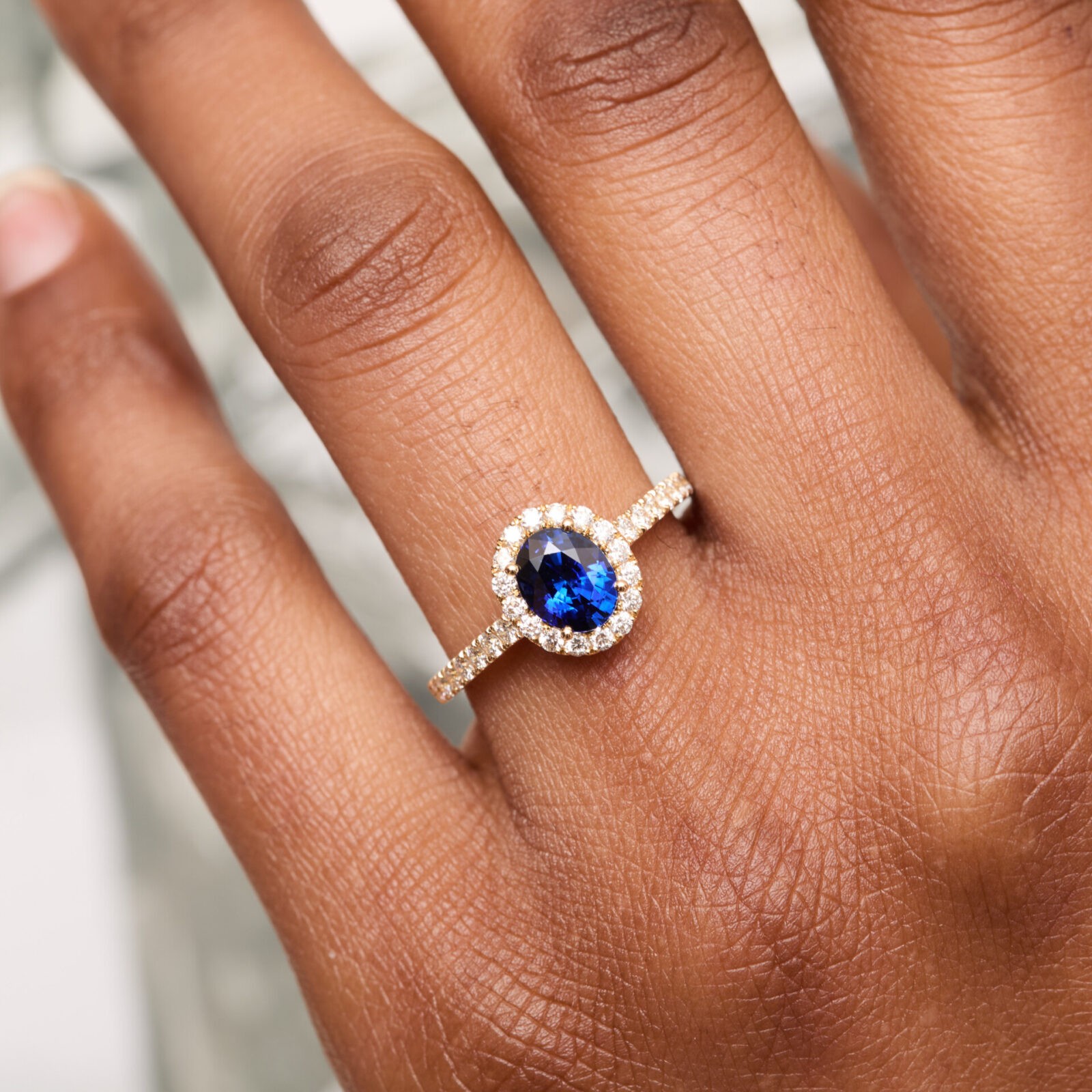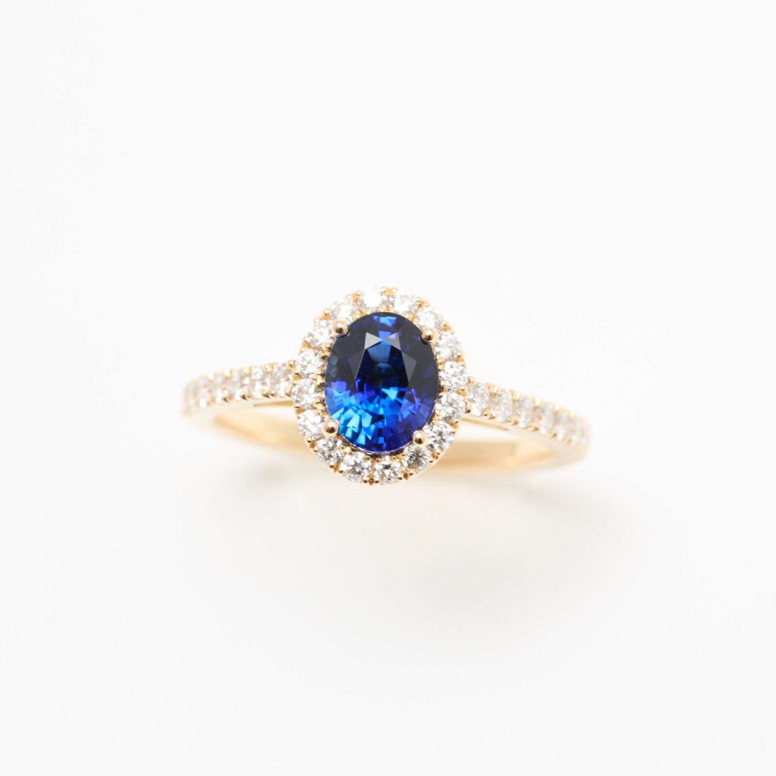- Bague Jaffna en or jaune sertie d’un saphir Peacock de 1.31 carats de forme ovale avec un entourage de 14 diamants FVS de 1.6mm et 16 diamants de 1.4mm sur l’anneau. (poids total 0.40 carats)