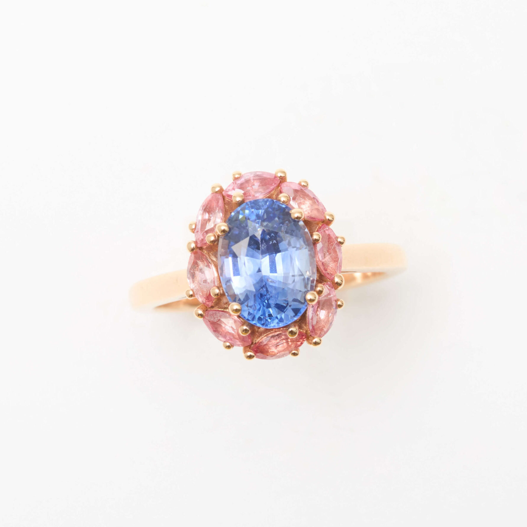 - Bague Matara en or rose 18 carats sertie d’un Saphir Cornflower 2.01 carats entouré de 8 saphirs padparadscha 0.36 carats.