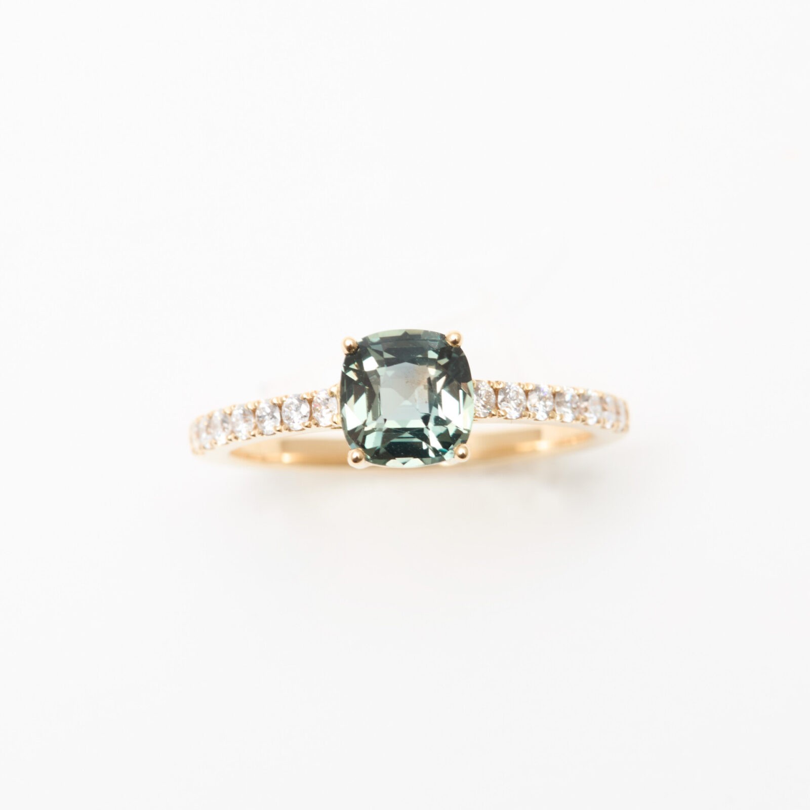 - Bague Trinco en or jaune sertie d’un Saphir Teal de 1.12 carats de forme coussin accompagné de 14 diamants FVS de 1.4mm sur l’anneau (poids total 0.14 carats)