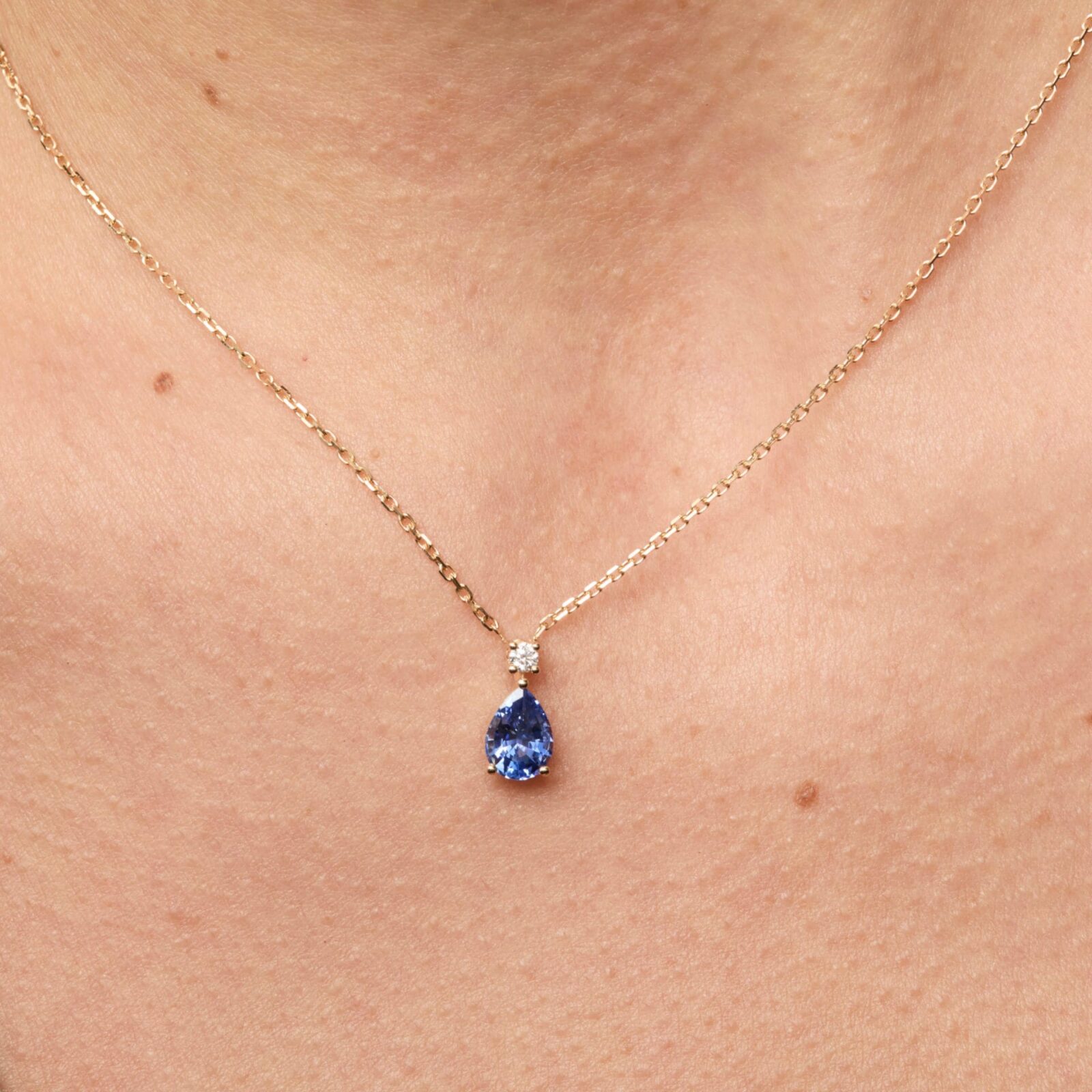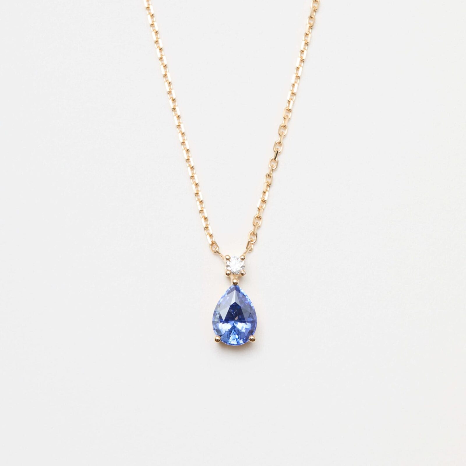 • Collier Ceylan en or jaune sertie d’un Saphir Cornflower de forme poire de 1.18 carats avec un diamants FVS de 2.4mm.