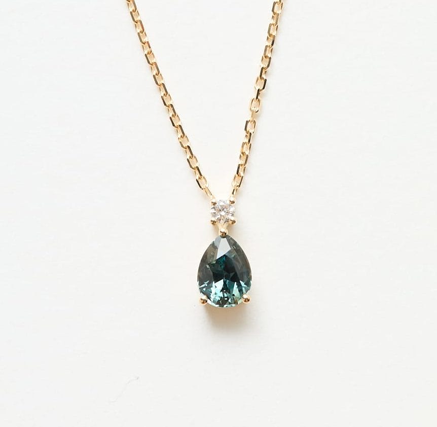 - Collier Ceylan en or jaune sertie d’un saphir Teal de forme poire de 1.20 carats avec un diamants FVS de 2.4mm.