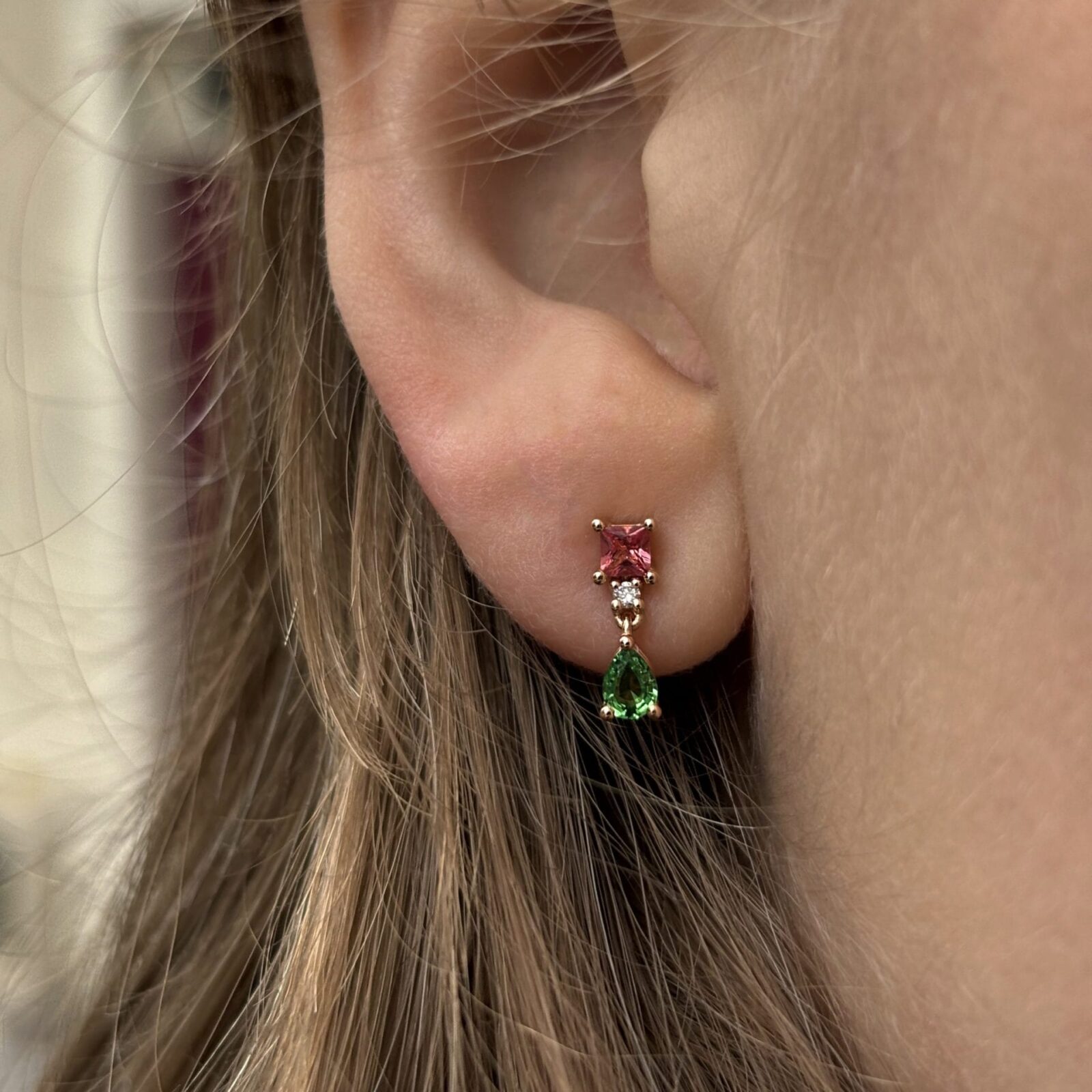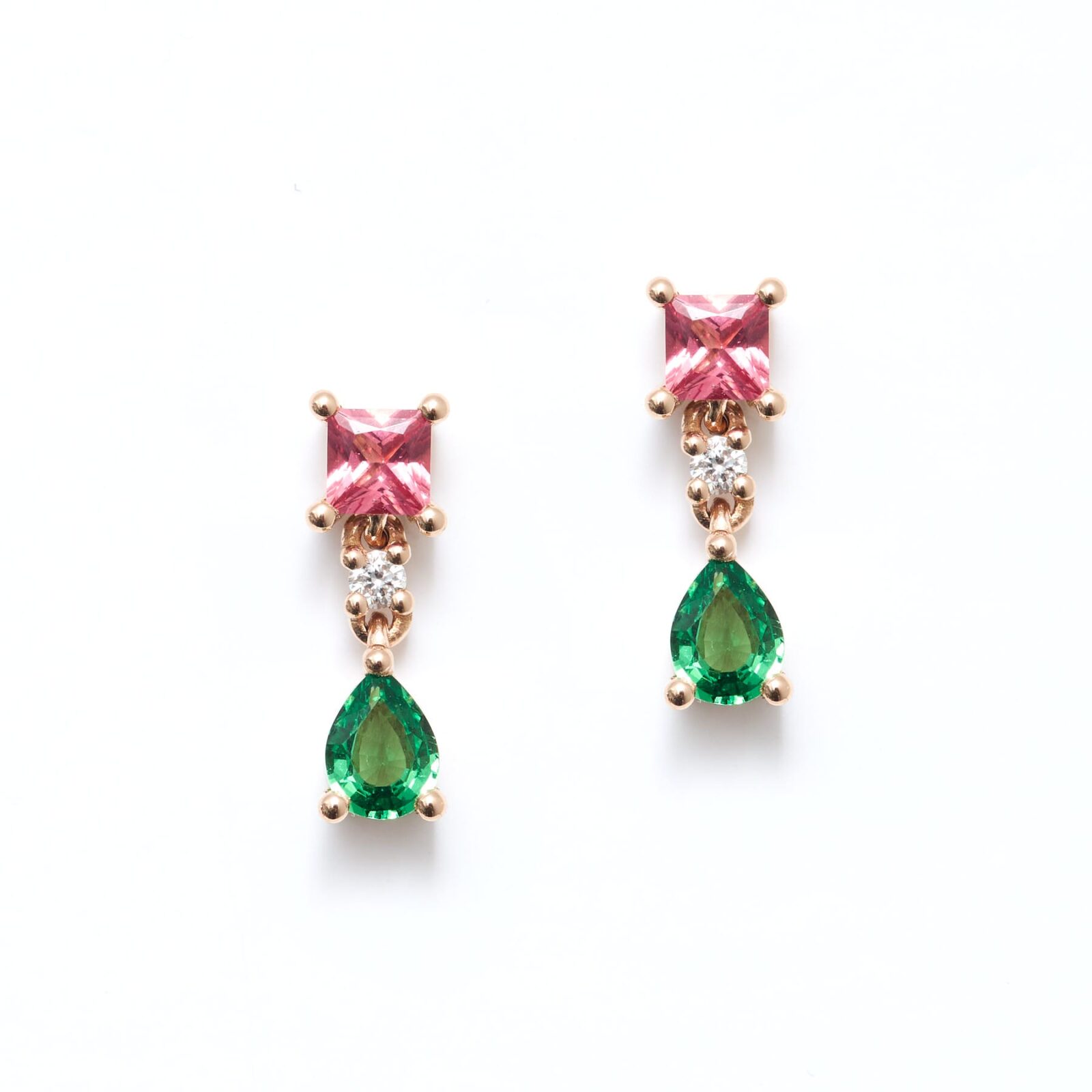 - Boucles d’oreilles en or rose sertie de deux Spinelles Mahenge et deux Tsavorites (poids total 0.61 carats) accompagnés de 2 diamants FVS 1.4mm.